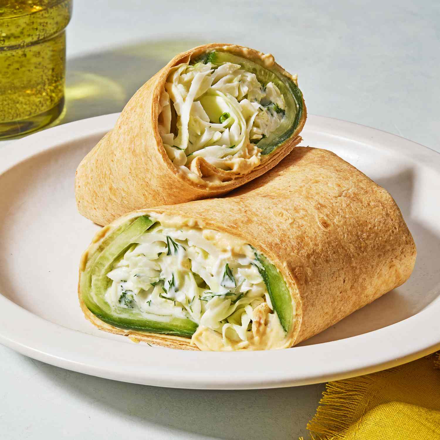 This cucumber-hummus wrap is a crisp, refreshing lunch packed with veggies. Shredded green cabbage adds a satisfying crunch, while the creamy dressing (flavored with pickle juice, but no pickles) adds tang without excess sodium. Hummus provides a creamy base that pairs perfectly with the fresh crispy vegetables. For a shortcut, swap in pre-shredded coleslaw mix instead of shredding your own cabbage.